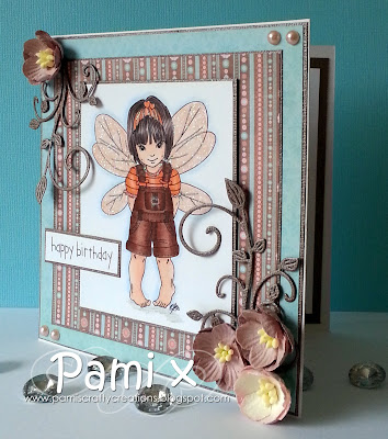 Isn't she adorable! I have coloured with copics and polychromos. The paper is from Samantha Walker Cuckoo 4 U - Chocolate Melon. The colours aren't ones I normally use so it was nice to do something different. The swirl die is Cheery Lynn mini fanciful flourish and then just added flowers, pearls and glamour dust.