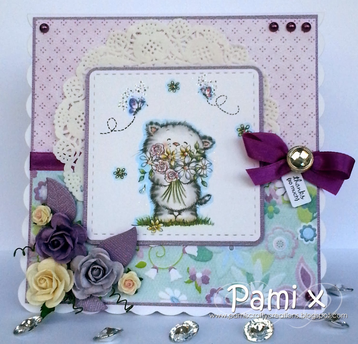 I have used the very gorgeous Leanne Ellis Designs image called Belle Flower. What a wonderful image this is. I have coloured with copics. The papers I think were free with a magazine but I can't remember which! I have added some glamour dust, flowers and silver book corner and pearls all from the Hobby House. I hope you like my card, please pop on over to the challenge blog to check out all the details!